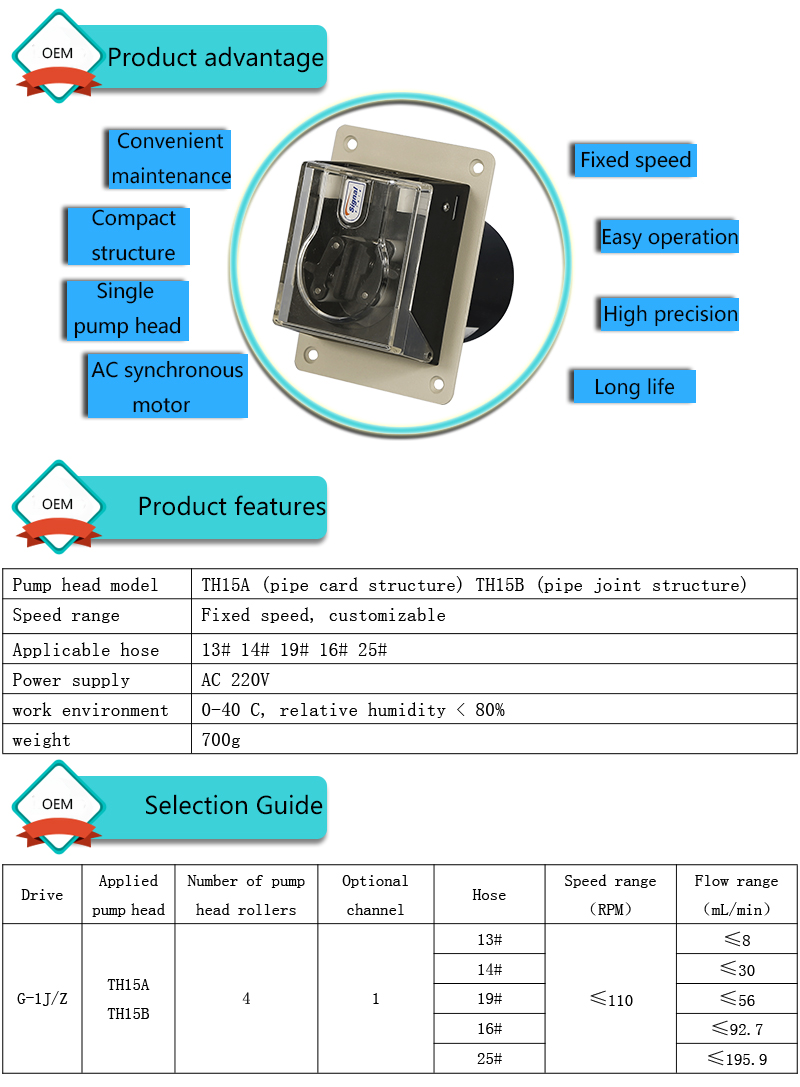 1. Flow range < 195.9ml/min 2. AC synchronous motor drive 3. Fixed speed, can be customized according to user needs 4. Installation of panel, 304 stainless steel, plastic spraying, optional material of panel